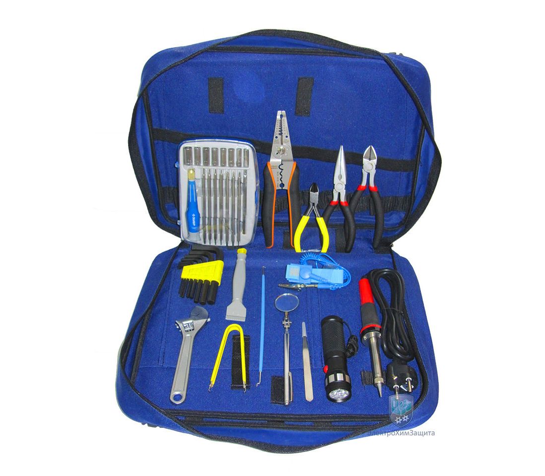 Профессиональный набор для электроники, включает плоскогубцы, отвертки, шестигранные ключи, цифровой мультиметр и паяльник с необходимыми для пайки приспособлениями.